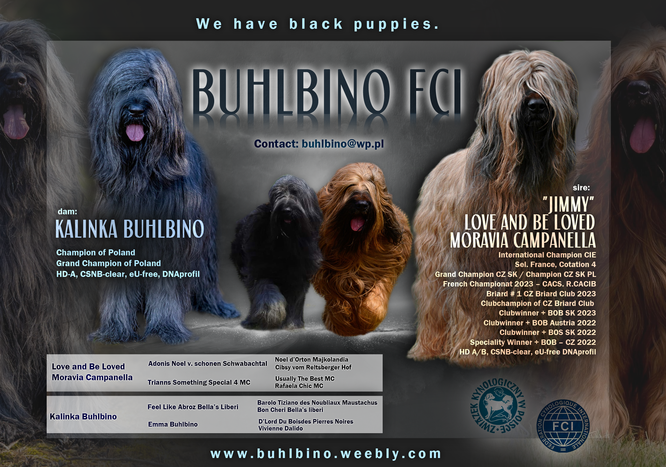 ![]() | Owczarek francuski Briard Buhlbino FCI Data urodzenia: 21-09-2025 Ojciec: Love and Be Loved Moravia Campanella Matka: Kalinka Buhlbino Ilość psów: 7 Ilość suk: 3 Hodowca: Anna Grządziel-Buhl Telefon: 505 299 098 Email: buhlbino@wp.pl www: www.buhlbino.weebly.com |